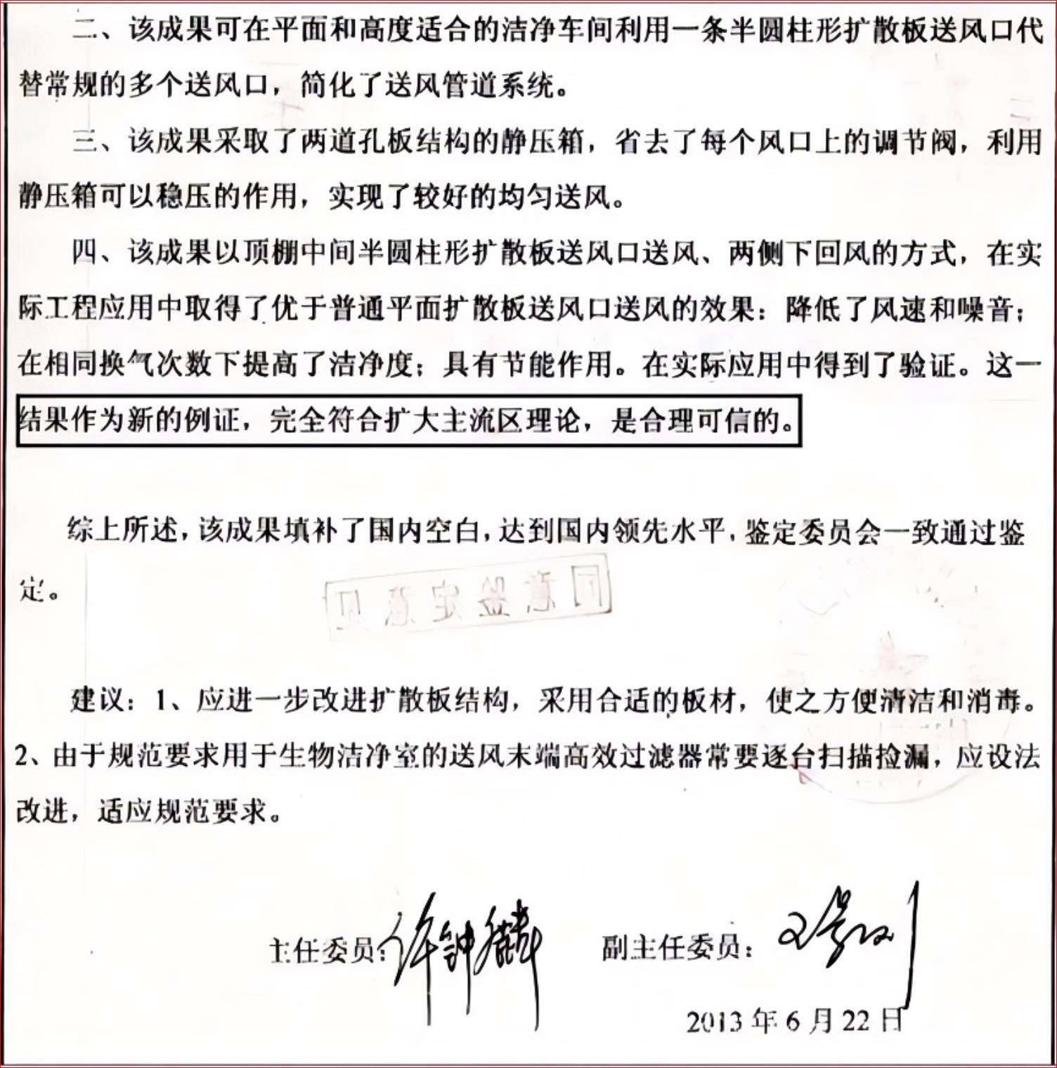 许钟麟作为中国空气洁净技术领域的奠基人,对稳态置换流技术(SSDV)从学术方面的评价:(2013年成果鉴定会)