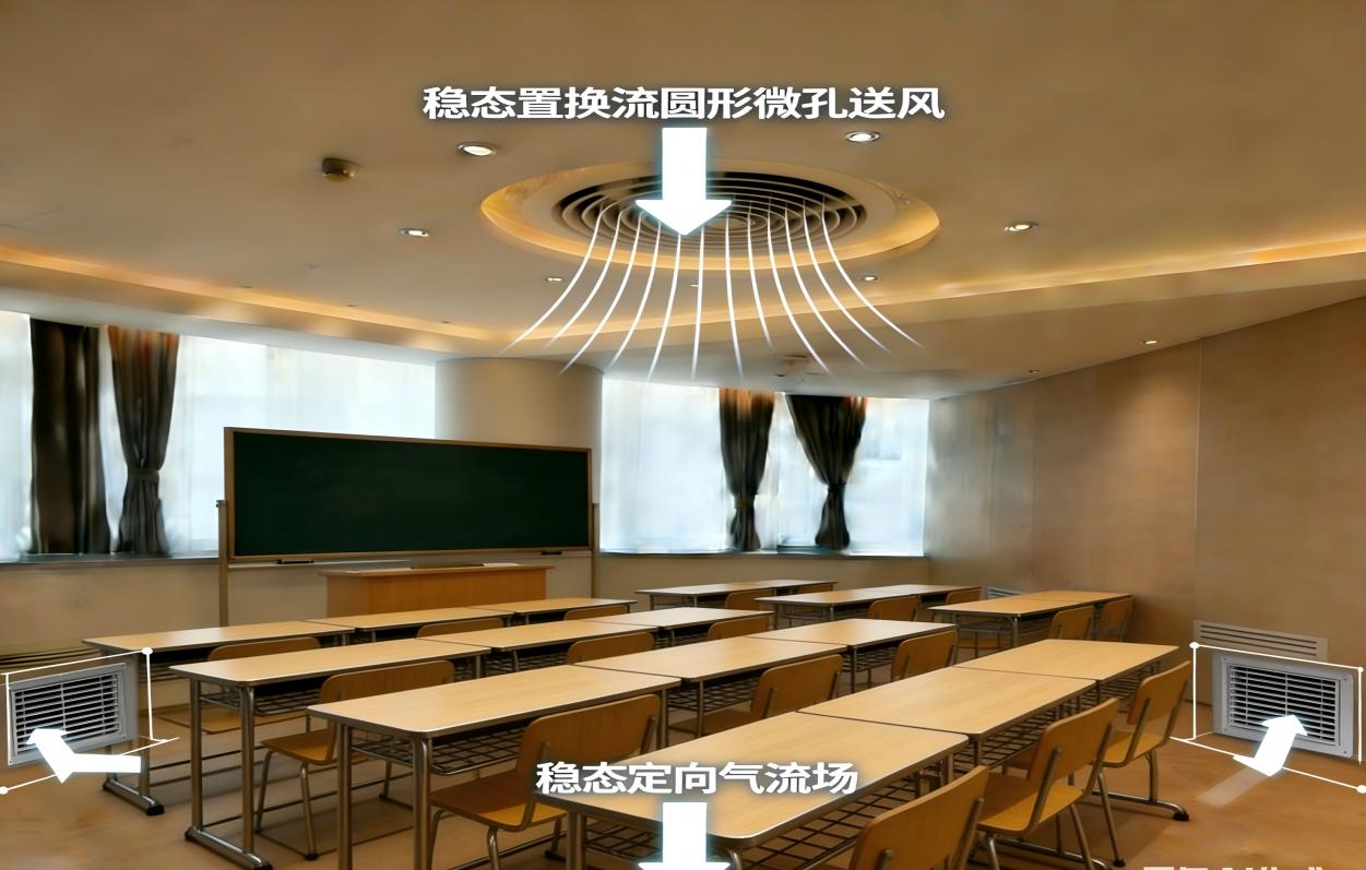 SSDV技术核心先进性:区别于传统乱流送风模式,可构建均匀、低速、稳态的定向气流场,实现“送风口-呼吸区-回风口”的无扰气流循环,避免气流紊乱导致的污染物滞留,同时最大化提升能量利用率,为节能与空气品质提升提供核心技术支撑,是目前教室空气优化领域的高效适配技术。